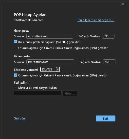 - Gelen Posta Sunucusu (POP3):