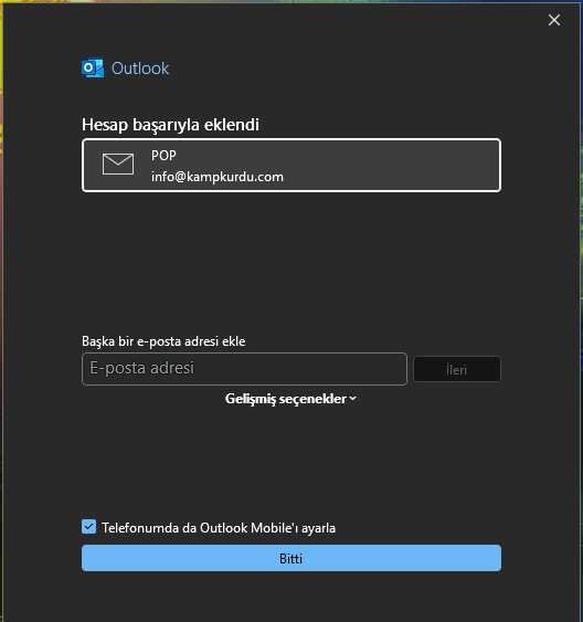 Outlook POP kurulumunu başarıyla tamamladınız.